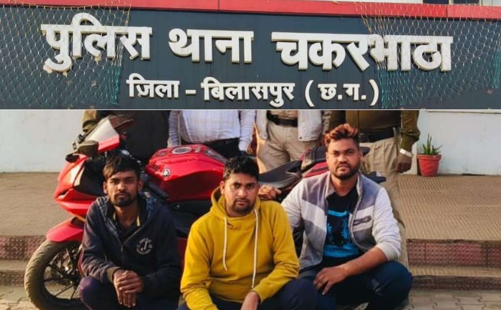 मिली जानकारी के अनुसार कीर्ति नगर तिफरा निवासी राजूदास मानिकपुरी पिता स्व. श्रवणदास मानिकपुरी ने सिरगिट्टी थाना बिलासपुर में रिपोर्ट दर्ज कराया कि 21.11 2024 के शाम 06.00 अपने मोटर सायकल यामहा R15 क्रमांक CG 10 BV 7975 से अपने गांव कड़ार के तालाब के पास गया था। नशा ज्यादा होने के कारण अपने घर ना जाकर मोटर सायकल को वही खड़ा करके सो गया था। कुछ देर बाद उठा तो देखा उसका मोटर सायकल वहां नही था। आसपास अपने मोटर सायकल यामहा का पता तलाश किया नहीं मिला। मोटर सायकल यामहा R15 क्रमांक CG 10 BV 7975 कीमती करीबन 02 लाख रुपए को कोई अज्ञात चोर चोरी कर ले गया था। रिपोर्ट पर थाना चकरभांठा में प्रकरण पंजीबद्ध कर विवेचना किया गया। विवेचना के दौरान मुखबीर से सूचना मिली कि मोटर सायकल सिलतरा में काम करने वाला एक व्यक्ति चला रहा है। सूचना पर वरिष्ठ अधिकारियों से निर्देशन एवं मार्गदर्शन लेकर दबिश दिया गया और एक व्यक्ति के कब्जे से मोटर सायकल जप्त किया गया। थाने लाकर उससे और उनके साथियों से पुछताछ किया गया तो आरोपी आशिष उर्फ गोल्डी तथा प्रकाश यादव दोनो निवासी ग्राम टेकारी मस्तूरी ने 21.11.2024 की शाम घटना स्थल से मोटर सायकल चोरी करना तथा खेमचंद उर्फ राहुल दिनकर निवासी कुरेली बिल्हा के पास बिक्री करना बताया। आरोपी खेमचंद्र उर्फ राहुल दिनकर के कब्जे से मोेटर यामहा R15 क्रमांक CG 10 BV 7975 कीमती करीबन 02 लाख रूपये को जप्त कर तीनों आरोपीयों को विधिवत गिरफ्तार कर न्यायालय के समक्ष पेश किया गया है।