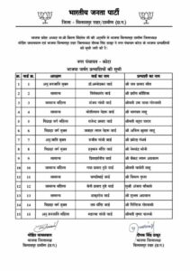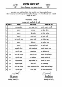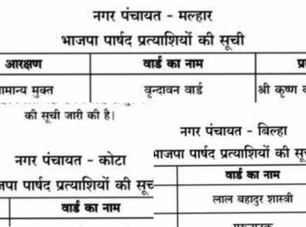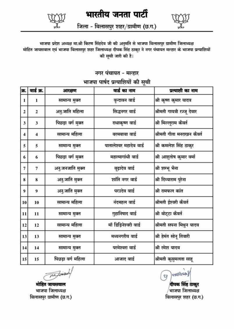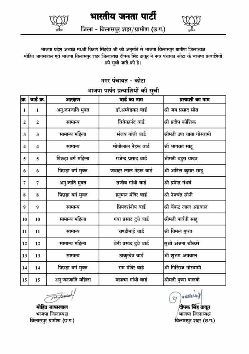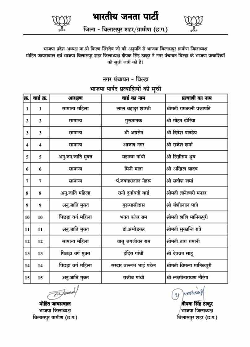 बिलासपुर। भारतीय जनता पार्टी ने कोटा, बिल्हा और मल्हार नगर पंचायत के प्रत्याशियों की सूची जारी कर दी है। इसी के साथ नगर निगम के दावेदारों की धड़कने बढ़ गई है। क्योंकि बड़े नेताओं के बीच अपने लोगों को टिकट दिलाने के लिए होड़ मची है। इस सूची के बाद कांग्रेस पर अपना प्रत्याशी जल्द घोषित करने का दबाव बढ़ गया है।