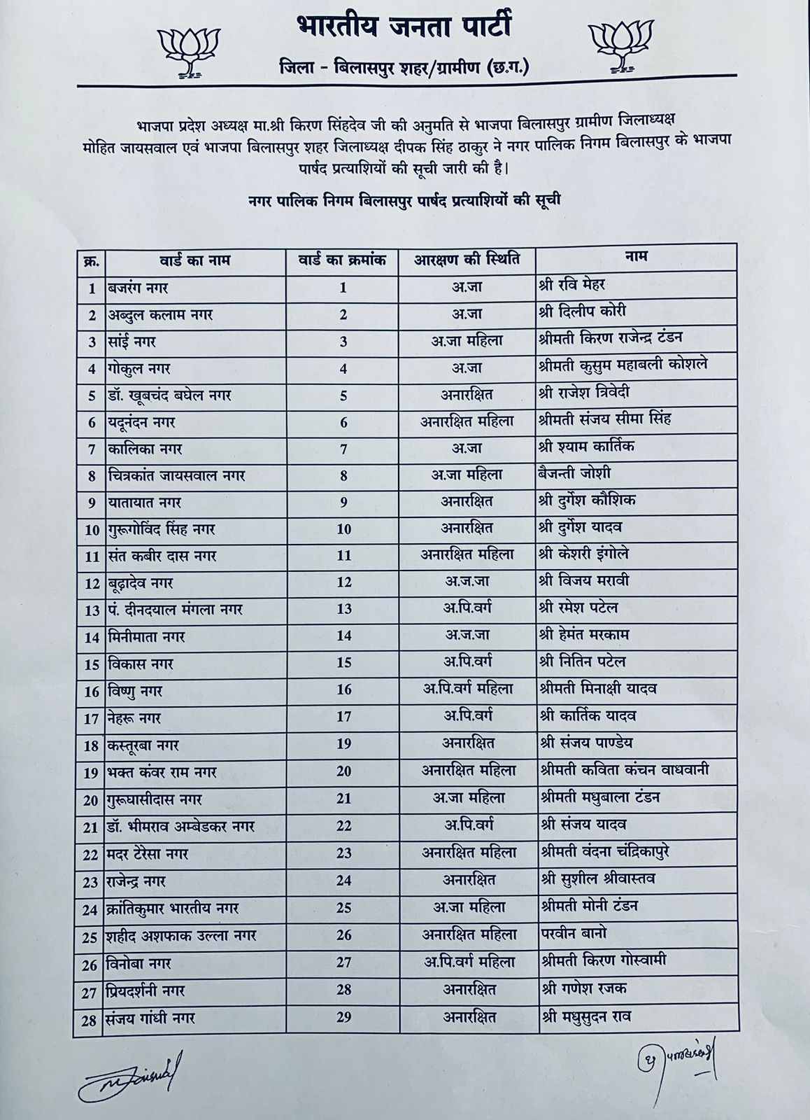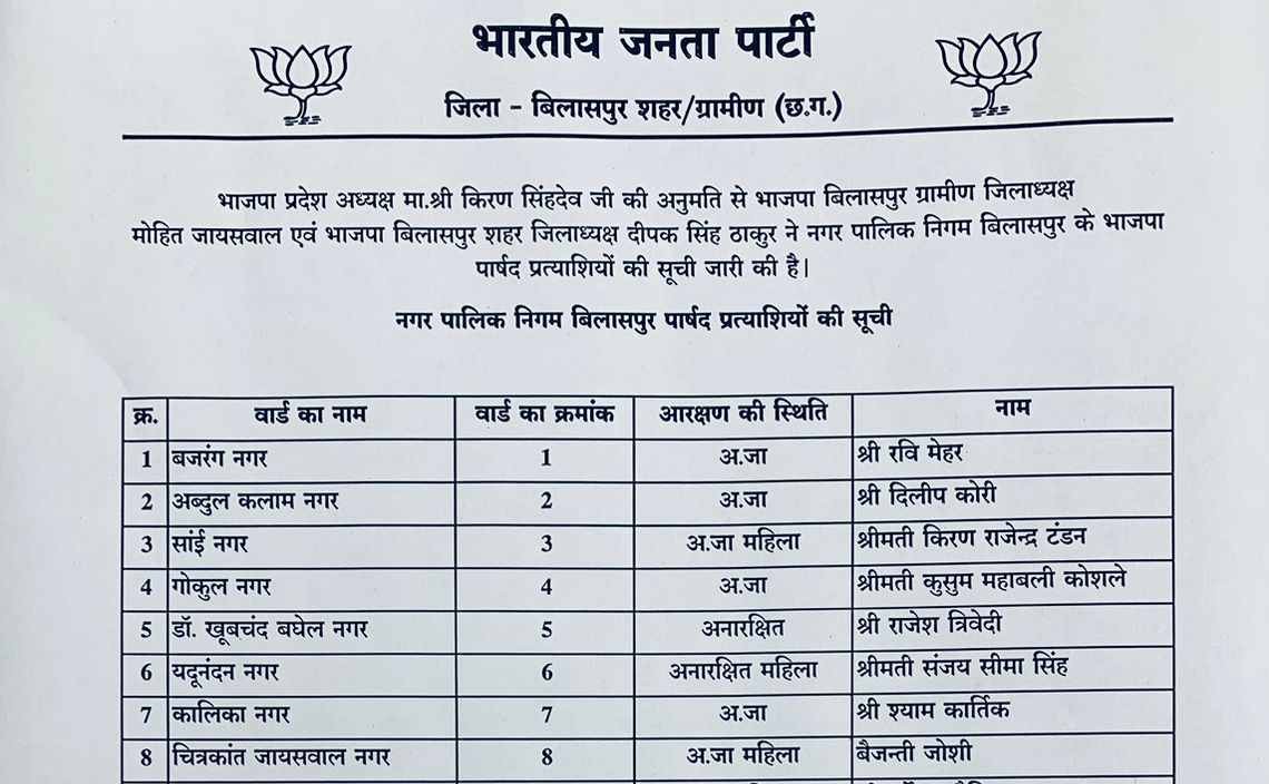 बिलासपुर। भारतीय जनता पार्टी ने बिलासपुर नगर निगम के सभी वार्डों के प्रत्याशियों की अंतिम सूची जारी कर दी है। देखे प्रत्याशियों की सूची…