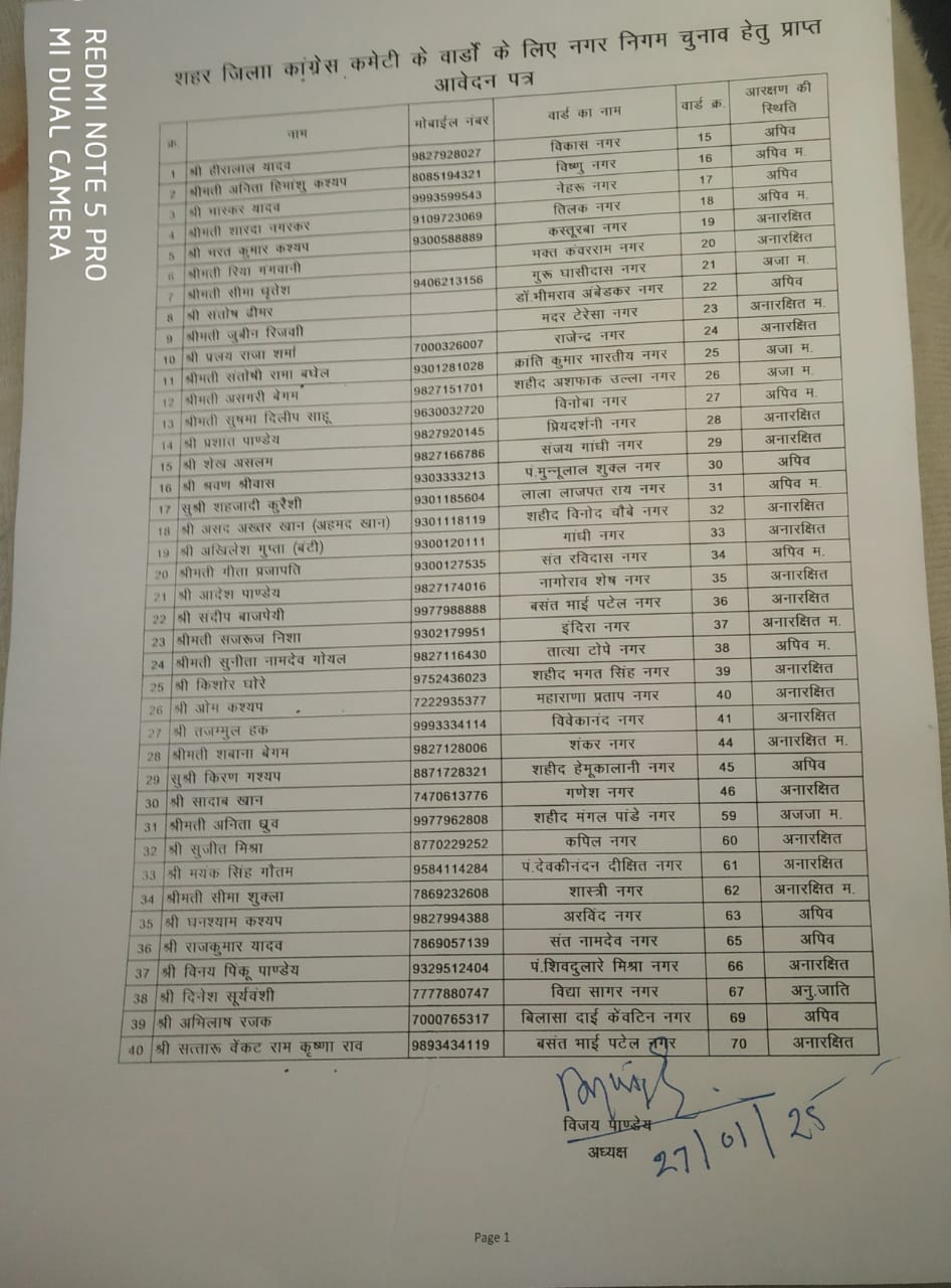 बिलासपु। कांग्रेस ने बिलासपुर नगर निगम के 40 वार्डों के प्रत्याशियों की सूची जारी कर दी है। बचे हुए वार्डों में प्रत्याशी कौन होगा देर शाम तक पता चल जाएगा। क्योंकि भारी दबाव के कारण प्रत्याशी फाइनल करने के लिए नेताओं के बीच जबरदस्त जोर आजमाइश चल रही है।