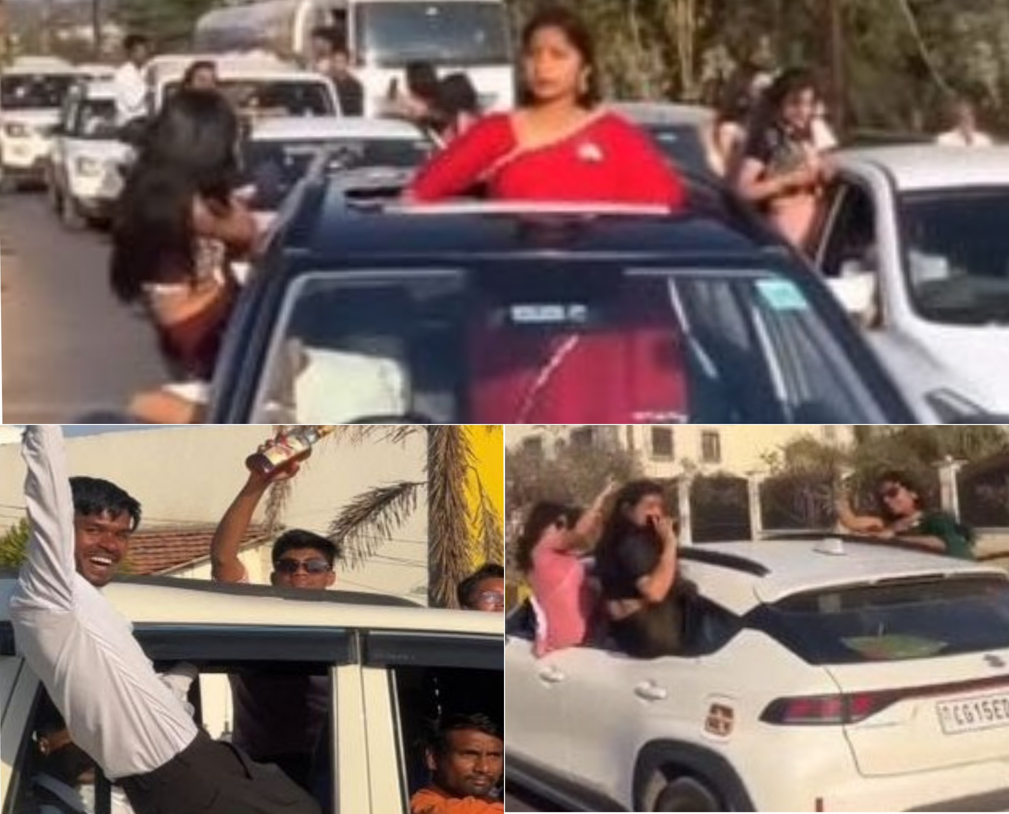 अंबिकापुर। फेयरवेल पार्टी के बाद 12वीं के छात्रों का सड़क में जमकर स्टंट किया। कार के दोनो तरफ लटके लड़के-लड़कियों शराब की बोतलें लहराई और नेशनल हाईवे पर रिल बनाकर सोशल मीडिया में डाला। एक सप्ताह बाद पुलिस में जुर्म दर्ज किया है।