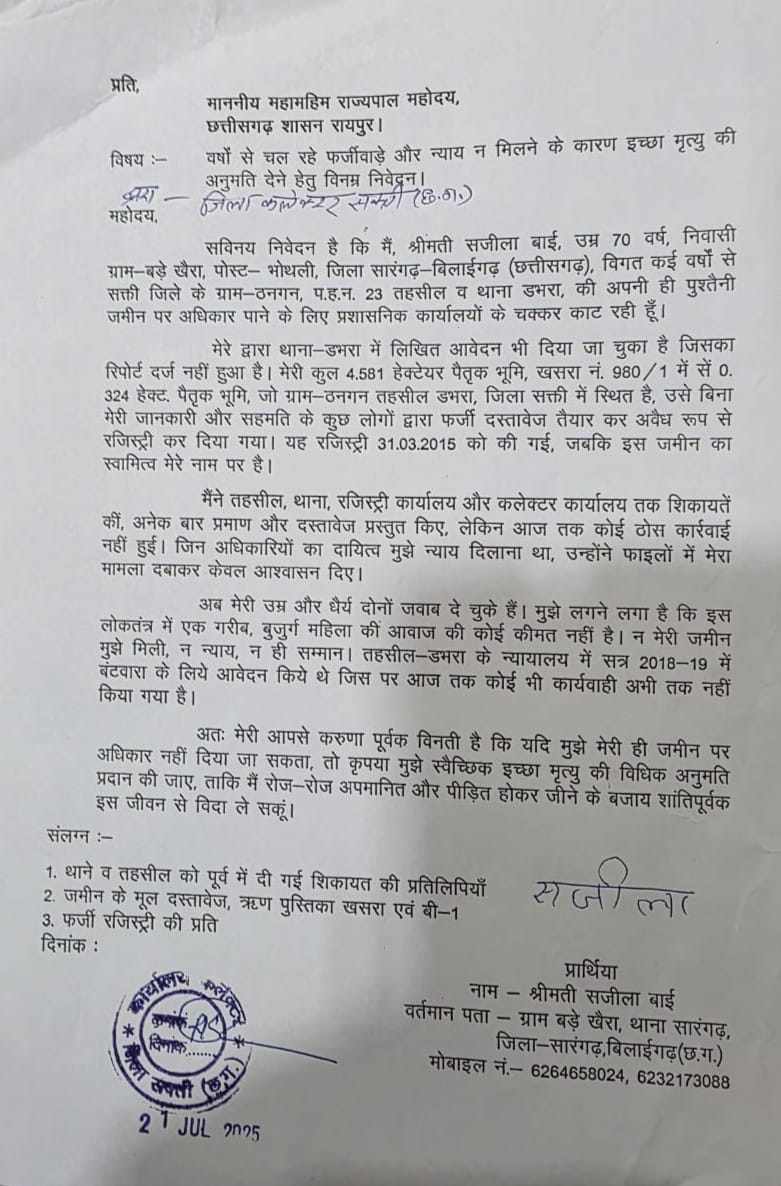 मामला शक्ति जिले का है। जिले के ग्राम बड़े खैरा में श्रीमती सजीला बाई रहती है। गांव में उनकी पुस्तैनी जमीन है। जिसको 2015 में किसी ने बेच दिया। इसके बाद से दोनो पति पत्नी का संघर्ष शुरू होता है। खुद की जमीन को पाने के लिए कोर्ट – कचहरी, थाना, वकील, बाबुओं और अफसरों के चक्कर काट रही है। लेकिन उन्हें न्याय नहीं मिला। यही कारण है कि निराश बुजुर्ग दंपत्ति ने प्रदेश के राज्यपाल को पत्र लिखकर सीधे मौत मांग ली है। अपने पत्र में सजीला बाई ने लिखा है कि ….