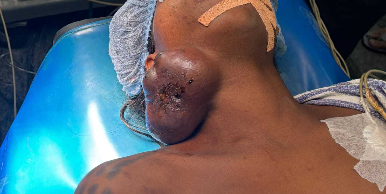 छत्तीसगढ़ के सुदूर आदिवासी क्षेत्र से संबंध रखने वाली 25 वर्षीय महिला जो बैगा जनजाति से हैं। अपने गले के दाएं भाग में लंबे समय से लगातार बढ़ रही सूजन के कारण स्थानीय डॉक्टर के पास गई। स्थानीय डॉक्टर ने बिना देर किए महिला को छत्तीसगढ़ इंस्टीट्यूट ऑफ मेडिकल साइंसेज़ (CIMS) बिलासपुर रेफ़र किया। यह सूजन लगभग एक वर्ष से धीरे-धीरे बढ़ रही थी। नींबू के आकार की यह सूजन बढ़ते बढ़ते कान के निचले भाग से लेकर कंधे तक फैल गई थी। इसमें से रुक-रुक कर रक्तस्राव भी होने लगा था।