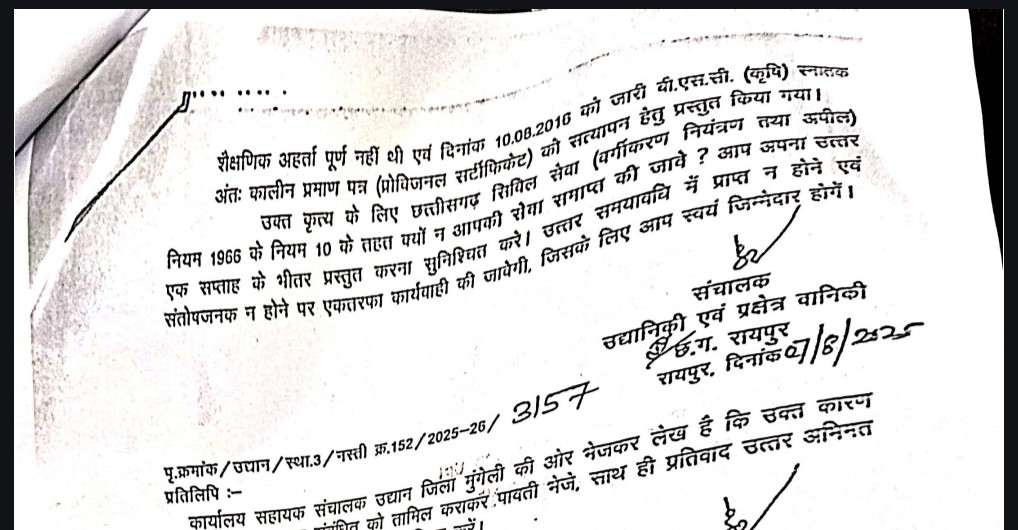 छत्तीसगढ़ के मुंगेली जिले में पदस्थ ग्रामीण उद्यान विस्तार अधिकारी शशिकांत साहू पर गंभीर अनियमितता और नौकरी हथियाने के लिए धोखाधड़ी करने का आरोप साबित हो चुका हैं। संचालनालय उद्यानिकी एवं प्रक्षेत्र वानिकी, रायपुर ने इन्हें आखरीबार कारण बताओ नोटिस जारी किया है। इसके साथ ही उनकी सेवा समाप्ति की कार्यवाही शुरू कर दी गई है। जांच में यह खुलासा हुआ है कि वर्ष 2015 की सीधी भर्ती में आवेदन की अंतिम तिथि 29 अगस्त 2015 तक श्री साहू के पास आवश्यक बी.एस.सी. (कृषि/उद्यानिकी/कृषि अभियांत्रिकी) की डिग्री नहीं थी। इसके बावजूद उन्होंने निःशक्तजन (दृष्टिबाधित) वर्ग में आवेदन किया। पात्रता न होने के बावजूद परीक्षा में बैठे और चयनित हो गए। सबसे बड़ा खुलासा यह हुआ है कि दस्तावेज़ सत्यापन के दौरान श्री साहू ने 10 अगस्त 2018 को जारी बी.एस.सी. (कृषि) का प्रोविजनल प्रमाण पत्र प्रस्तुत किया था। यानी विज्ञापन की अंतिम तिथि के लगभग तीन साल बाद का। यह न केवल चयन प्रक्रिया के साथ छल है बल्कि योग्य उम्मीदवारों के अधिकारों का भी हनन है। विभागीय जांच में आरोप प्रमाणित पाए जाने के बाद अब नियम 10, छत्तीसगढ़ सिविल सेवा (वर्गीकरण, नियंत्रण एवं अपील) नियम 1966 के तहत बर्खास्तगी की कार्रवाई की जाएगी। यही कारण है कि विभाग ने अंतिम नोटिस जारी करते हुए जवाब के लिए 7 दिन का समय दिया है। इसके बाद सीधे बर्खास्तगी का आदेश जारी किया जाएगा।