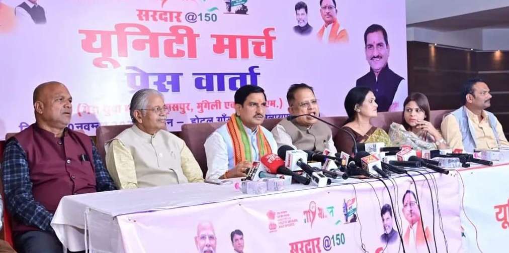 केंद्रीय राज्य मंत्री तोखन साहू ने प्रेस वार्ता लेकर सरदार @150 यूनिटी मार्च के संबंध में विस्तृत जानकारी दी। उन्होंने बताया कि यह आयोजन लौह पुरुष सरदार वल्लभ भाई पटेल की 150वीं जयंती को समर्पित है। बिलासपुर संसदीय क्षेत्र में भी पदयात्रा आयोजित होगी। सरदार पटेल का दृढ़ नेतृत्व कूटनीतिक कौशल और राष्ट्रीय एकता के प्रति अटूट प्रतिबद्धता आज भी पीढियों की प्रेरित करती है और यूनिटी मार्च यात्रा उनकी अमर विरासत को समर्पित है। यह यात्रा सरदार पटेल के एकीकृत भारत के दृष्टिकोण को प्रधानमंत्री नरेन्द्र मोदी के विकसित और आत्मर्निभर भारत के मिशन से जोड़ते हुए जनभागीदारी से एक राष्ट्रीय अभियान बनाएगी।